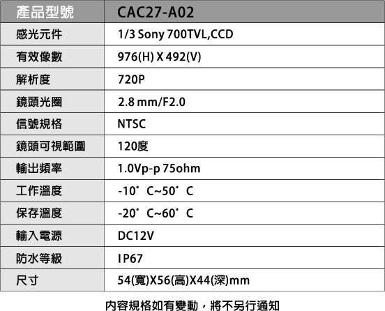 1/3 Sony 700TVL, CCD |