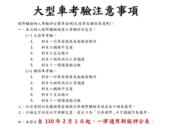 Li Rui-Ming, Director of the Kaohsiung Motor Vehicle Office, stated that to help large vehicle drivers develop good habits and stay aware of people and vehicles around the vehicle body, the new regulations include checking the "Driving Vision Assistance System." This is evaluated through verbal recitation during the exam, where the recited content must at least include the key phrase "Driving Vision."